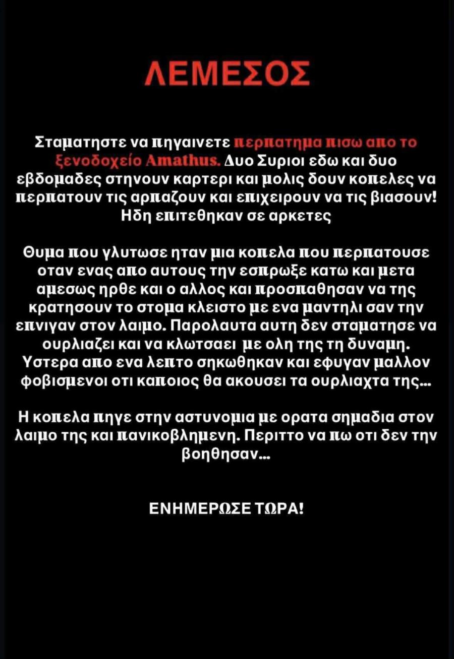 Πανικό σκόρπισε στα μέσα κοινωνικής δικτύωσης ανάρτηση που κάνει λόγο για παρενόχληση γυναικών από αλλοδαπούς σε παραλιακό πεζόδρομο στη Λεμεσό.