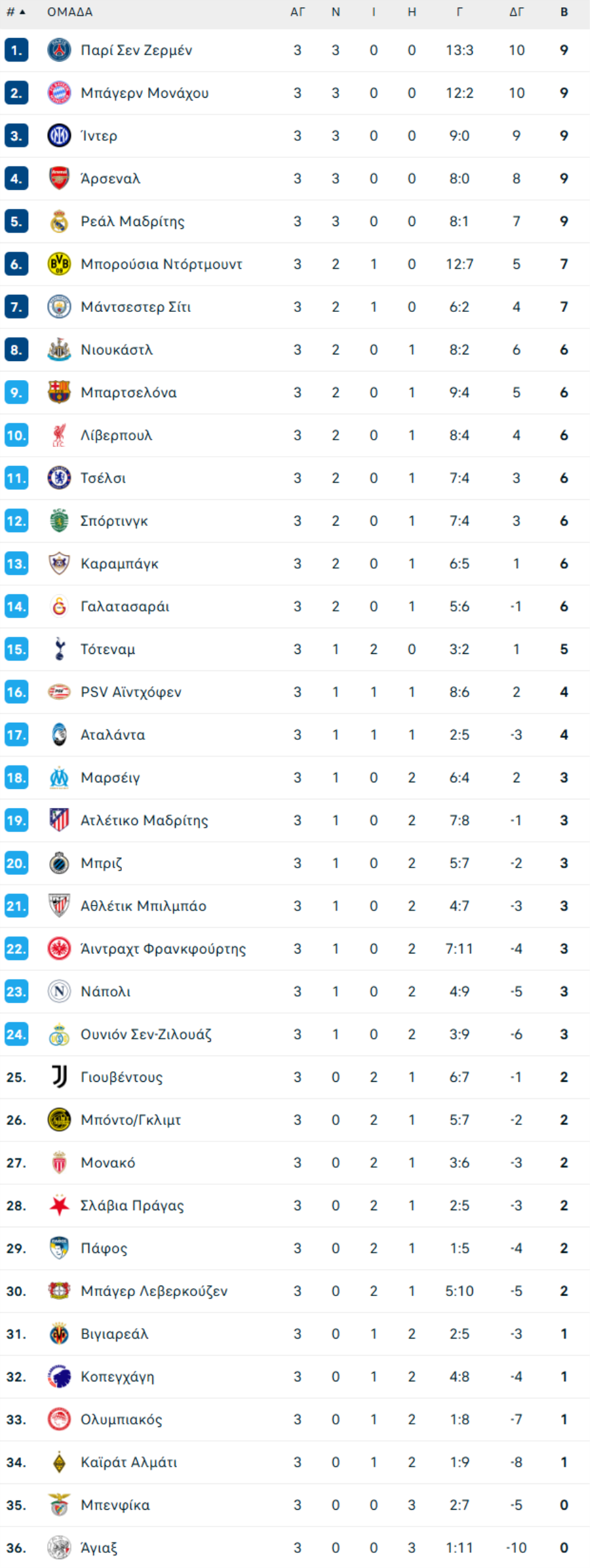 Δείτε πως διαμορφώνεται η βαθμολογία της League Phase του Champions League μετά την ολοκλήρωση της 3ης αγωνιστικής.