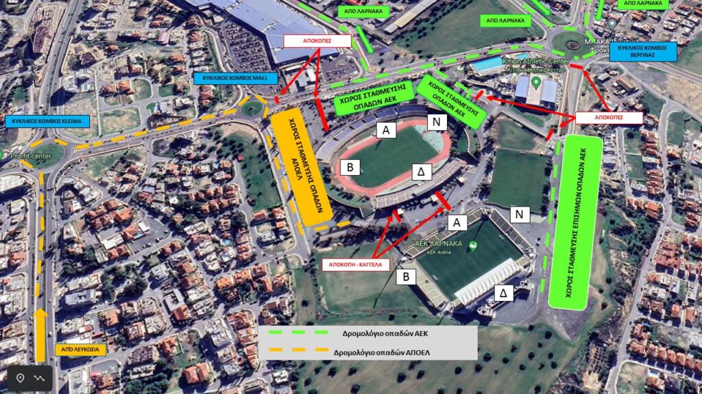 Οι φίλαθλοι του ΑΠΟΕΛ για την άφιξη τους στο στάδιο, προερχόμενοι από τη Λευκωσία στον κυκλικό κόμβο Ριζοελιάς, να ακολουθήσουν ευθεία πορεία μέχρι τον κυκλικό κόμβο KLEIMA. Στον κυκλικό κόμβο KLEIMA να ακολουθήσουν την 3η έξοδο και να κατευθυνθούν δεξιά προς το στάδιο ΓΣΖ. Ακολούθως στον κυκλικό κόμβο του MALL να κατευθυνθούν δεξιά προς τη βόρεια πλευρά των σταδίων ΓΣΖ και ΑΕΚ ΑΡΕΝΑ, όπου και θα μπορούν να σταθμεύουν, σύμφωνα με το σχεδιαγράφημα που δημοσιεύεται. Για την αποχώρηση τους να χρησιμοποιήσουν το ίδιο αντίστοιχο δρομολόγιο.