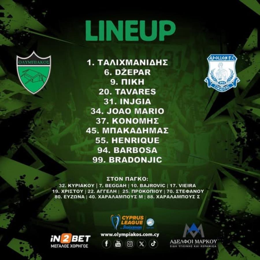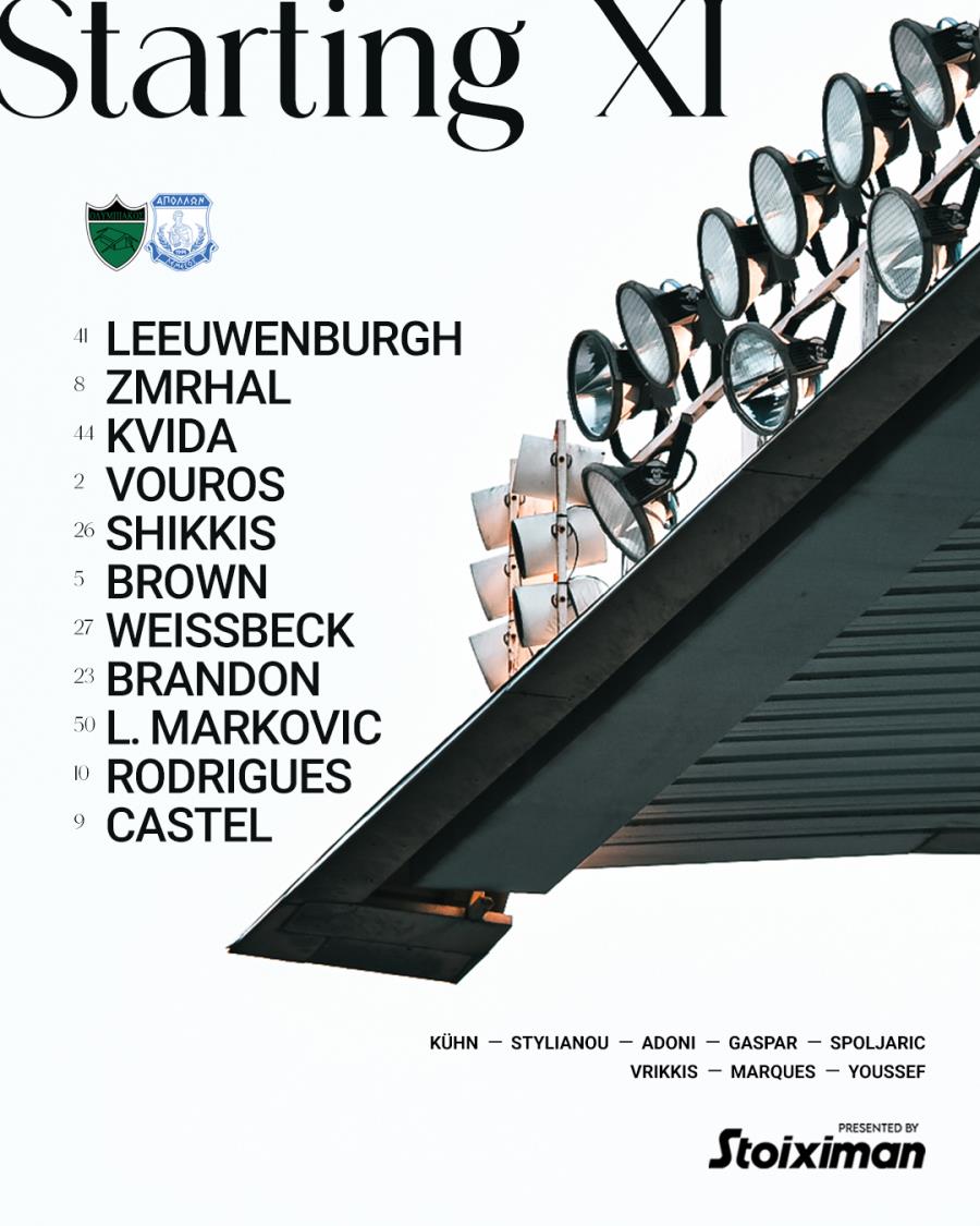 Απόλλων (Αυγουστή): Λέουβενμπεργκ, Ροντρίγκες, Βούρος, Κβίντα, Σιήκκης, Μπράουν, Βέισμπεκ, Ζμέρχαλ, Καστέλ, Μάρκοβιτς, Τόμας.