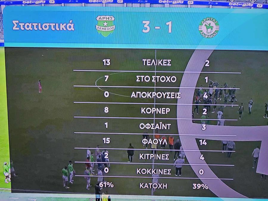 Άρης–Ακρίτας 3-1 (Kακουλλής 4', Κβιλιτάια 42' πεν., Εφαγκέ 82'/Ρομό 7')  Άρης: Φοδέρινγχαμ, Γκόλντσον, Κορέια, Κβιλιτάια (Μουσούντα 87'), Μπουράν, Γιαγκό, Σανέ, Νίκολιτς(Κοβαλένκο 72'), Γκάουσταντ(Εφαγκέ 72'), Μόντνορ, Κακουλλής (Μαγιαμπέλα 55'). Στον πάγκο: Βάνα Άλβες, Σωφρονίου, Μπαλογκούν, Μακόσλαντ, Θεοδοσίου.  Ακρίτας Χλώρακας: Περντρέου, Μίλερ, Αντωνίου (Μπάρι 77'), Ρομό, Φερνάντες(Ριέρα 86'), Άντονι, Κάστρο(Αθανασίου 77'), Ιωάννου, Χατζηβασίλης (Μορέιρα 86'), Ζάμπελιν, Ζήνωνος. Στον πάγκο: Θεοκλή, Μπέκερ, Γενεθλίου, Ρέινολντς, Χατζηπασχάλης, Ντουμπόφ, Βασιλείου, Ανάνγκ. Κίτρινες: Γιαγκό 29', Μοντνόρ 37'/ Χατζηβασίλης 49', Κάστρο 60', Φερνάντες 63', Άντονι 74'Διαιτητής: Κωνσταντινίδης Αντώνης  Α' Βοηθός Διαιτητής: Αναστασίου Στέφανος Β' Βοηθός Διαιτητής: Λάμπρου Λάμπρος 4ος Διαιτητής: Χατζηγεωργίου Παναγιώτης VAR: Τσαμπαλάς Ανδρέας AVAR: Τζιωρτζής Όμηρος Παρατηρητής: Αργυρού Μιχάλης *4 αλλαγές σε σχέση με Ανόρθωση: Μπουράν, Σανέ, Γιαγκό, Κακουλλής αντί Καλούλου, , Μαγιαμπέλα, Γκομίς, Χαραλάμπους. *4 αλλαγές σε σχέση με Ομόνοια Αρ.: Μίλερ, Αντωνίου, Φερνάντες, Χατζηβασίλη αντί Καμπλάν, Μπάρι, Αθανασίου, Ταφερτσχόφερ *Ο VARίστας κάλεσε τον ρεφ για περίπτωση πέναλτι υπέρ Άρη όμως προηγήθηκε επιθετικό φάουλ.  *Ντεμπούτο Σανέ, Κοβαλένκο