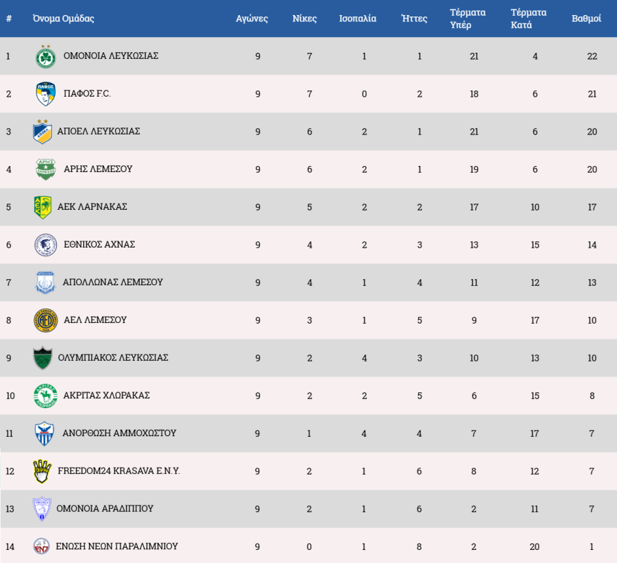 9η αγωνιστική: Παρασκευή, 31 Οκτωβρίου Άρης–Ακρίτας 3-1 (Kακουλλής 4', Κβιλιτάια 42' πεν., Εφαγκέ 82'/Ρομό 7') Σάββατο, 1 Νοεμβρίου Ομόνοια Αρ.– Ολυμπιακός 0-1 (Tαβάρες 55') ΕΝΠ–Ομόνοια 0-2 (Μαέ 3', Γιόβετιτς 32') ΑΠΟΕΛ–Εθνικός 4-1 (Λαΐφης 52', Πιέρος 65', 74' πεν., Κόρμπου 90'/Αντερέγκεν 16') Κυριακή, 2 Νοεμβρίου ΕΝΥ–Ανόρθωση 0-1 (Σένσι 78' πεν.) Πάφος–ΑΕΛ 1-0 (Ντράγκομιρ 5') Απόλλωνας–ΑΕΚ 1-2 (Κβίντα 48'/Ροντέν 51', Ισκιέρδο 80')