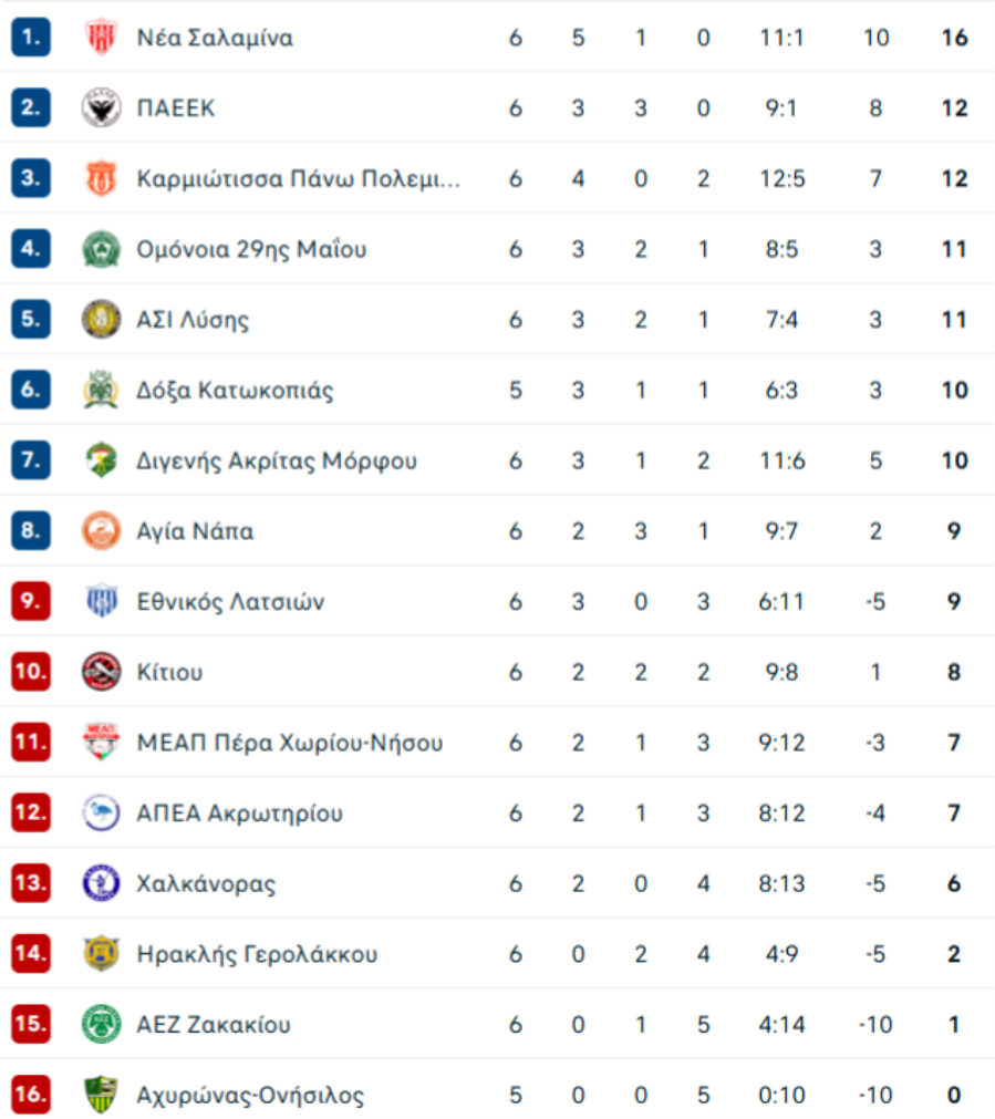 Η ΒΑΘΜΟΛΟΓΙΑ μετά από 6 αγωνιστικές:
