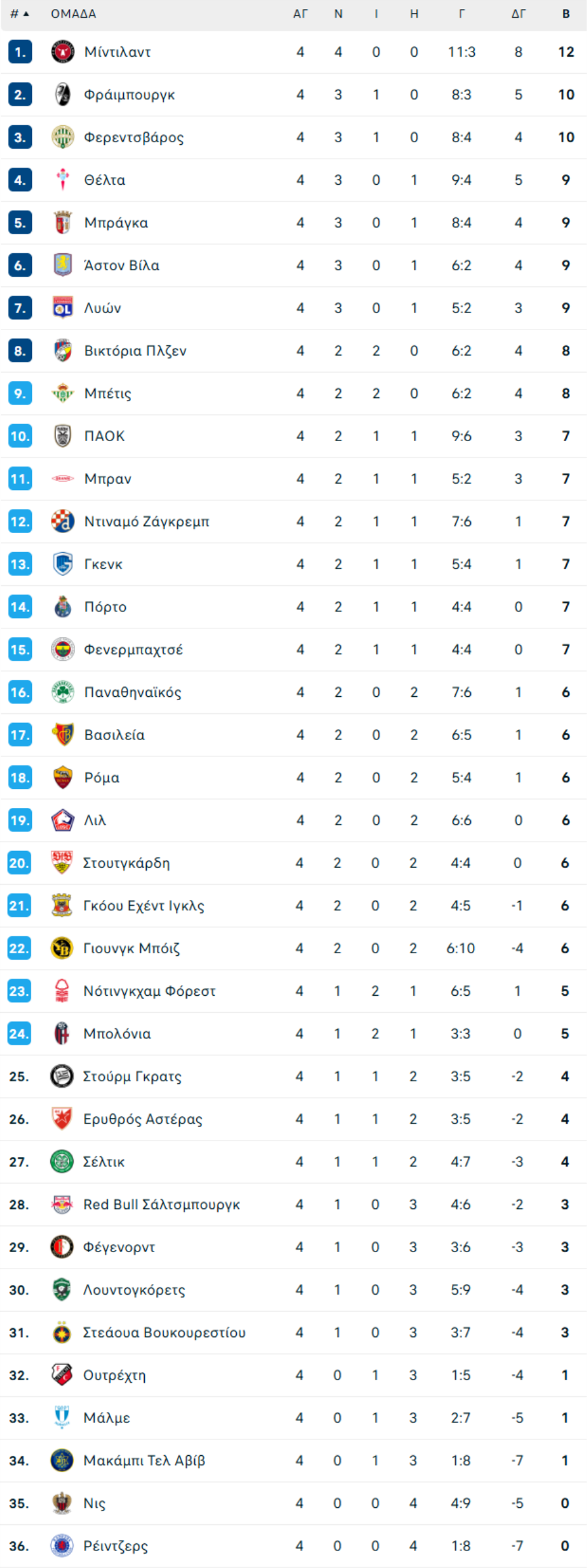 - -5η αγωνιστική: 27.11. 19:45 Άστον Βίλα-Γιουνγκ Μπόιζ Βικτόρια Πλζεν-Φράιμπουργκ Λιλ-Ντιναμό Ζάγκρεμπ Λουντογκόρετς-Θέλτα ΠΑΟΚ-Μπραν Πόρτο-Νις Ρόμα-Μίντιλαντ Φέγενορντ-Σέλτικ Φενερμπαχτσέ-Φερεντσβάρος 27.11. 22:00 Γκενκ-Βασιλεία Γκόου Εχέντ Ιγκλς-Στουτγκάρδη Ερυθρός Αστέρας-Στεάουα Βουκουρεστίου Μακάμπι Τελ Αβίβ-Λυών Μπέτις-Ουτρέχτη Μπολόνια-Red Bull Σάλτσμπουργκ Νότινγκχαμ Φόρεστ-Μάλμε Παναθηναϊκός-Στούρμ Γκρατς Ρέιντζερς-Μπράγκα - -6η αγωνιστική: 11.12. 19:45 Γιουνγκ Μπόιζ-Λιλ Λουντογκόρετς-ΠΑΟΚ Μίντιλαντ-Γκενκ Νις-Μπράγκα Ντιναμό Ζάγκρεμπ-Μπέτις Ουτρέχτη-Νότινγκχαμ Φόρεστ Στουτγκάρδη-Μακάμπι Τελ Αβίβ Στούρμ Γκρατς-Ερυθρός Αστέρας Φερεντσβάρος-Ρέιντζερς 11.12. 22:00 Βασιλεία-Άστον Βίλα Θέλτα-Μπολόνια Λυών-Γκόου Εχέντ Ιγκλς Μπραν-Φενερμπαχτσέ Παναθηναϊκός=Βικτόρια Πλζεν Πόρτο-Μάλμε Σέλτικ-Ρόμα Στεάουα Βουκουρεστίου-Φέγενορντ Φράιμπουργκ-Red Bull Σάλτσμπουργκ - -7η αγωνιστική: 22.01. 19:45 Βικτόρια Πλζεν-Πόρτο Γιουνγκ Μπόιζ-Λυών Μάλμε-Ερυθρός Αστέρας Μπολόνια-Σέλτικ Μπραν-Μίντιλαντ ΠΑΟΚ-Μπέτις Φέγενορντ-Στούρμ Γκρατς Φενερμπαχτσέ-Άστον Βίλα Φράιμπουργκ-Μακάμπι Τελ Αβίβ 22.01. 22:00 Θέλτα-Λιλ Μπράγκα-Νότινγκχαμ Φόρεστ Νις-Γκόου Εχέντ Ιγκλς Ντιναμό Ζάγκρεμπ-Στεάουα Βουκουρεστίου Ουτρέχτη-Γκενκ Ρέιντζερς-Λουντογκόρετς Ρόμα-Στουτγκάρδη Red Bull Σάλτσμπουργκ-Βασιλεία Φερεντσβάρος-Παναθηναϊκός - -8η αγωνιστική: 29.01. 22:00 Άστον Βίλα-Red Bull Σάλτσμπουργκ Βασιλεία-Βικτόρια Πλζεν Γκενκ-Μάλμε Γκόου Εχέντ Ιγκλς-Μπράγκα Ερυθρός Αστέρας-Θέλτα Λιλ-Φράιμπουργκ Λουντογκόρετς-Νις Λυών-ΠΑΟΚ Μακάμπι Τελ Αβίβ-Μπολόνια Μίντιλαντ-Ντιναμό Ζάγκρεμπ Μπέτις-Φέγενορντ Νότινγκχαμ Φόρεστ-Φερεντσβάρος Παναθηναϊκός-Ρόμα Πόρτο-Ρέιντζερς Σέλτικ-Ουτρέχτη Στεάουα Βουκουρεστίου-Φενερμπαχτσέ Στουτγκάρδη-Γιουνγκ Μπόιζ Στούρμ Γκρατς-Μπραν - - - -