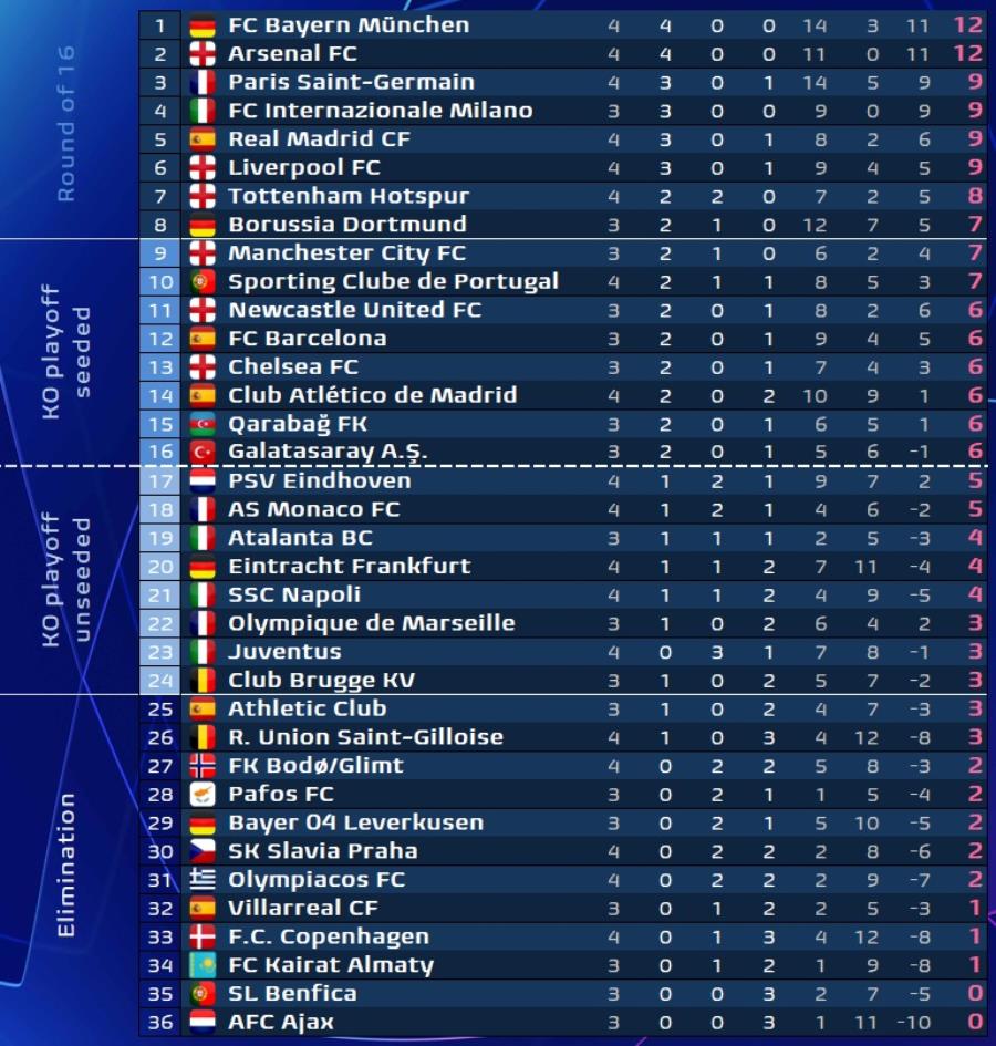 Στο φινάλε της αναμέτρησης με την Αϊντχόφεν, ο Ολυμπιακός «πληγώθηκε», έμεινε στο 1-1 και στα χαμηλά της βαθμολογίας του Champions League. Πήρε ωστόσο ακόμη έναν βαθμό στη φετινή διοργάνωση και πλέον βρίσκεται στην 31η θέση με 2 βαθμούς. Η Λίβερπουλ επικράτησε με 1-0 στο μεγάλο ντέρμπι απέναντι στην Ρεάλ Μαδρίτης (1-0), ενώ η Μπάγερν των δέκα παικτών άντεξε στο Παρίσι, έφυγε με το «διπλό» και έφτασε τους 12 βαθμούς όσους έχει και η Άρσεναλ που ακολουθεί στην 2η θέση, μετά το άνετο πέρασμα από την έδρα της Σλάβια Πράγας (0-3).
