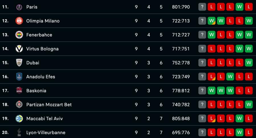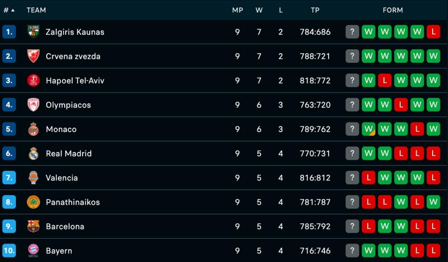 Παράλληλα, ο Παναθηναϊκός AKTOR μετά την ήττα του στο Βελιγράδι έμεινε στο 5-4, ενώ στην κορυφή υπάρχει τριπλή ισοβαθμία των Ζάλγκιρις, Ερυθρού Αστέρα και Χάποελ Τελ Αβίβ με ρεκόρ 7-2.