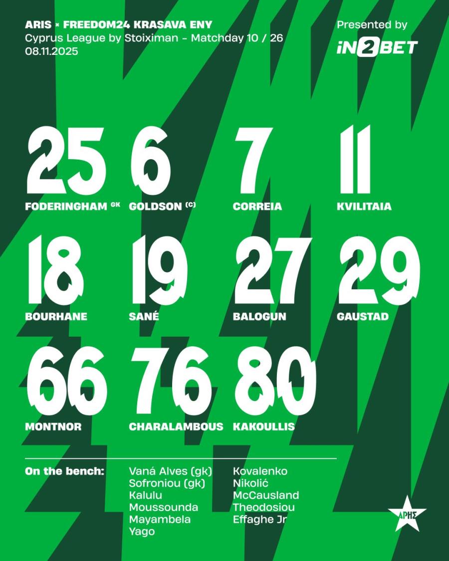 Άρης: Φοδέρινχαμ, Γκόλντσον, Κορέια, Κβιλιτάια, Μπουράν, Σανέ, Μπαλόγκουν, Γκάουσταντ, Μοντνόρ, Χαραλάμπους, Κακουλλής.