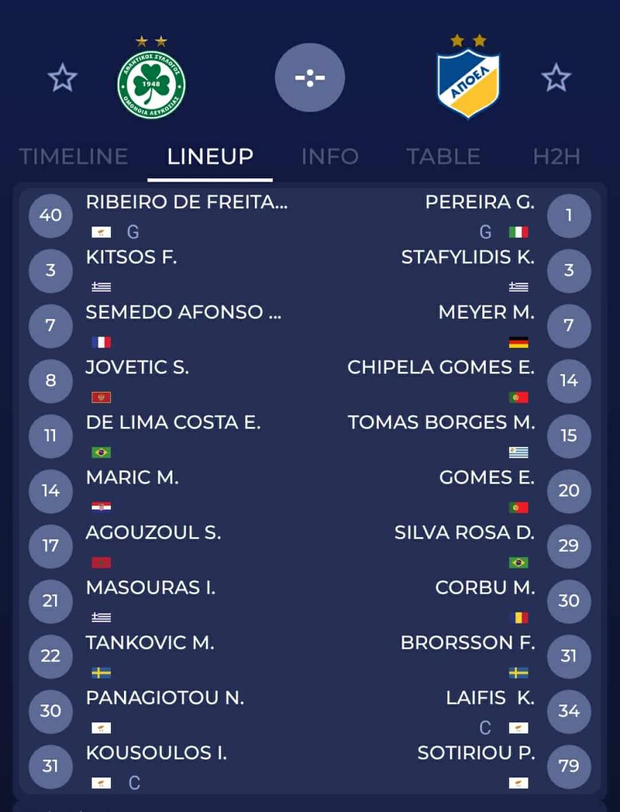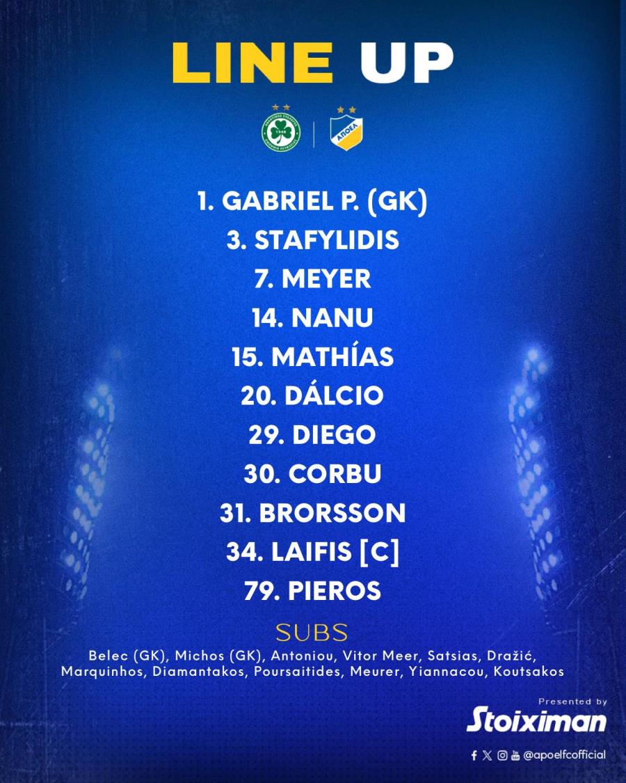 ΑΠΟΕΛ: Περέιρα, Σταφυλίδης, Μέγιερ, Νανού, Τομάς, Ντάλσιο, Ρόσα, Κόρμπου, Μπρόρσον, Λαϊφης, Πιέρος
