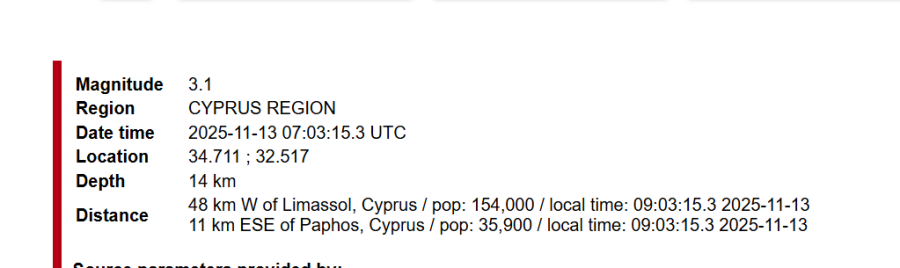 Themasports teamΝέα ασθενής σεισμική δόνηση καταγράφηκε σήμερα Πέμπτη, 13 Νοεμβρίου 2025, σύμφωνα με τα στοιχεία του Ευρωμεσογειακού Σεισμολογικού Κέντρου. Ο σεισμός σημειώθηκε στις 07:03:15 (UTC), δηλαδή 09:03 τοπική ώρα , με μέγεθος 3.1 Ρίχτερ, στην Kύπρο.