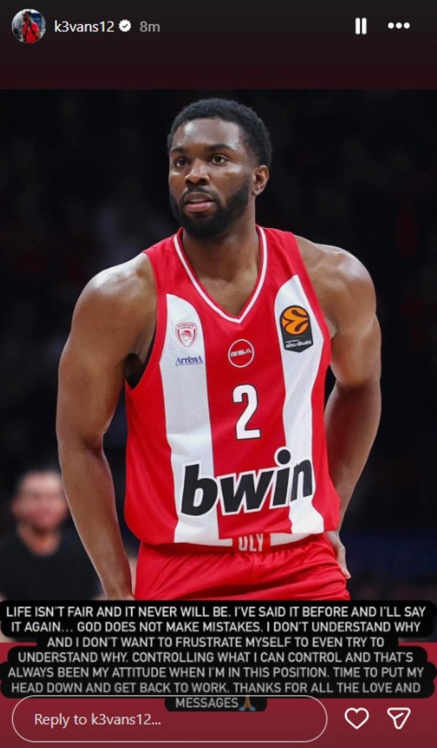 Themasports teamΟ Κίναν Έβανς έστειλε, μέσω μιας ανάρτησής του στα social media, το πρώτο του μήνυμα μετά τον σοβαρό τραυματισμό που υπέστη στην αναμέτρηση του Ολυμπιακού με τη Ζάλγκιρις.