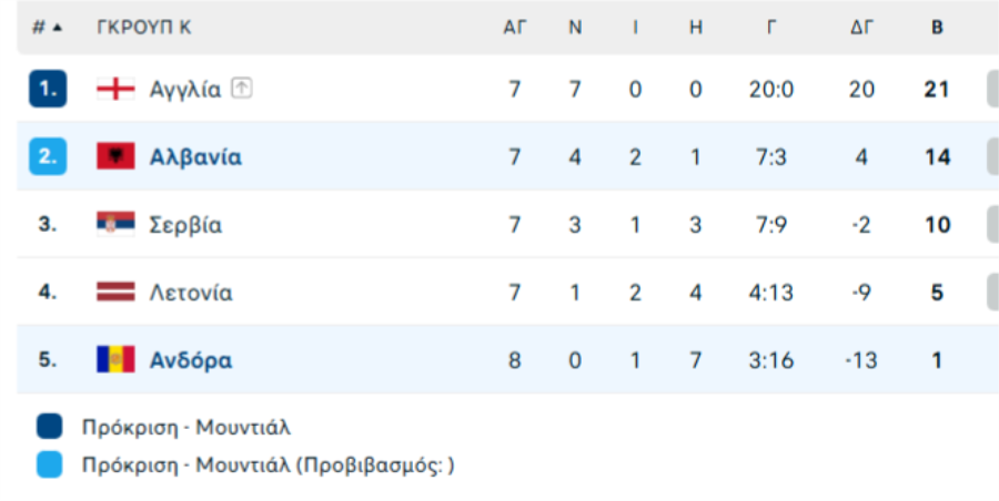 Στο ενδέκατο γκρουπ, η αδιάφορη Αγγλία επιβλήθηκε 2-0 της Σερβίας με τέρματα των Σάκα (28’) και Έζε (90’) και την άφησε οριστικά τρίτη, με την Αλβανία να εκμεταλλεύεται το αποτέλεσμα αυτό και να κλειδώσει τα playoffs με το 1-0 (67’ Ασλάνι) κόντρα στην Ανδόρα.