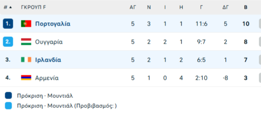 Δεύτερη στη βαθμολογία του 6ου ομίλου είναι η Ουγγαρία, που νωρίτερα είχε νικήσει 1-0 τους Αρμένιους με γκολ του Βάργκα (33’) και πάει σε... τελικό με τους Ιρλανδούς, εντός έδρας, σε τρεις μέρες, με την ισοπαλία να της σφραγίζει τα playoffs.