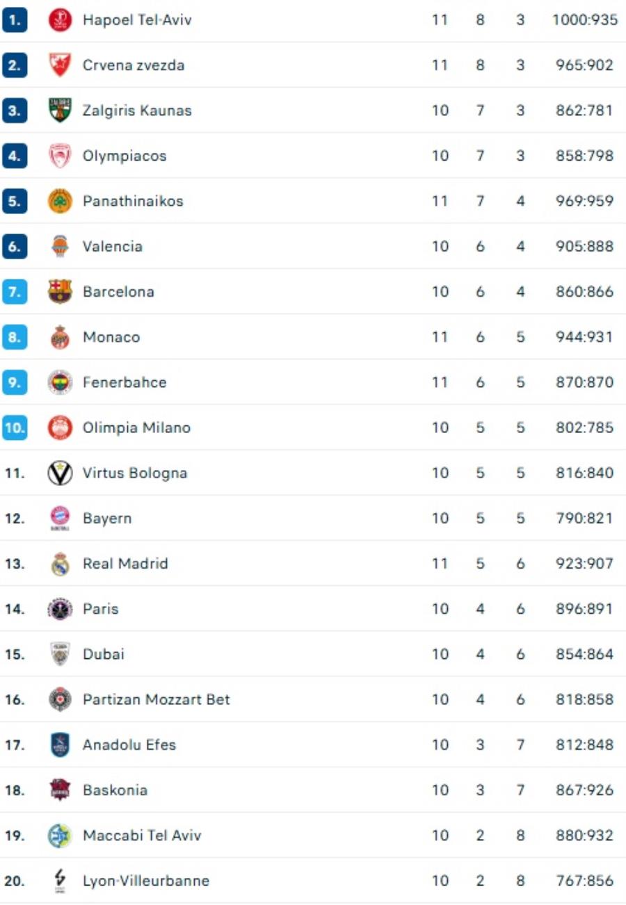 Στην κορυφή της βαθμολογίας, αλλά με συγκάτοικο τον Ερυθρό Αστέρα (8-3), ο οποίος επιβλήθηκε 91-79 της Μονακό. Ευκαιρία για να βρεθεί εκεί έχει ο Ολυμπιακός με νίκη επί της Αρμάνι την Παρασκευή.