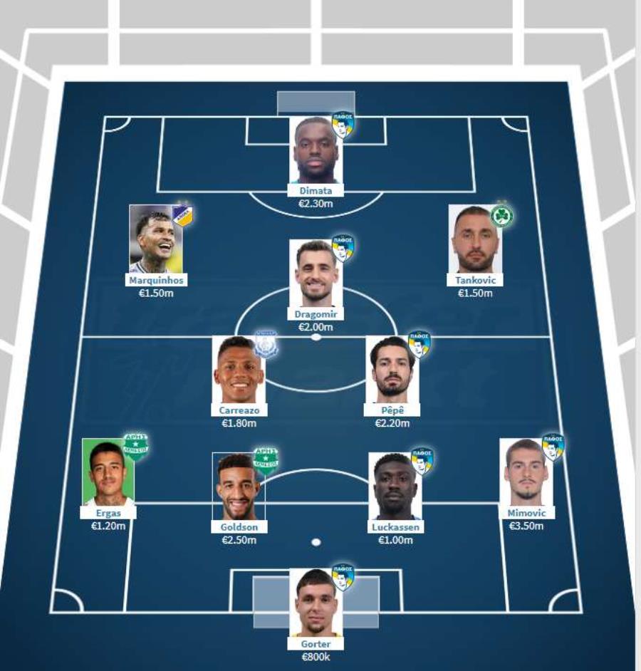 Τζέι Γκόρτερ, Μίμοβιτς,, Λουκάσεν, Γκόλτσον, Ρόμπερτ Έργκας, Πέπε, Μαρσελίνιο, Βλαντ Ντράγκομιρ, Μουαμέρ Τάνκοβιτς, Μαρκίνιος, Ντιμάτα η 11άδα, από την οποία απουσιάζει το κυπριακό στοιχείο.