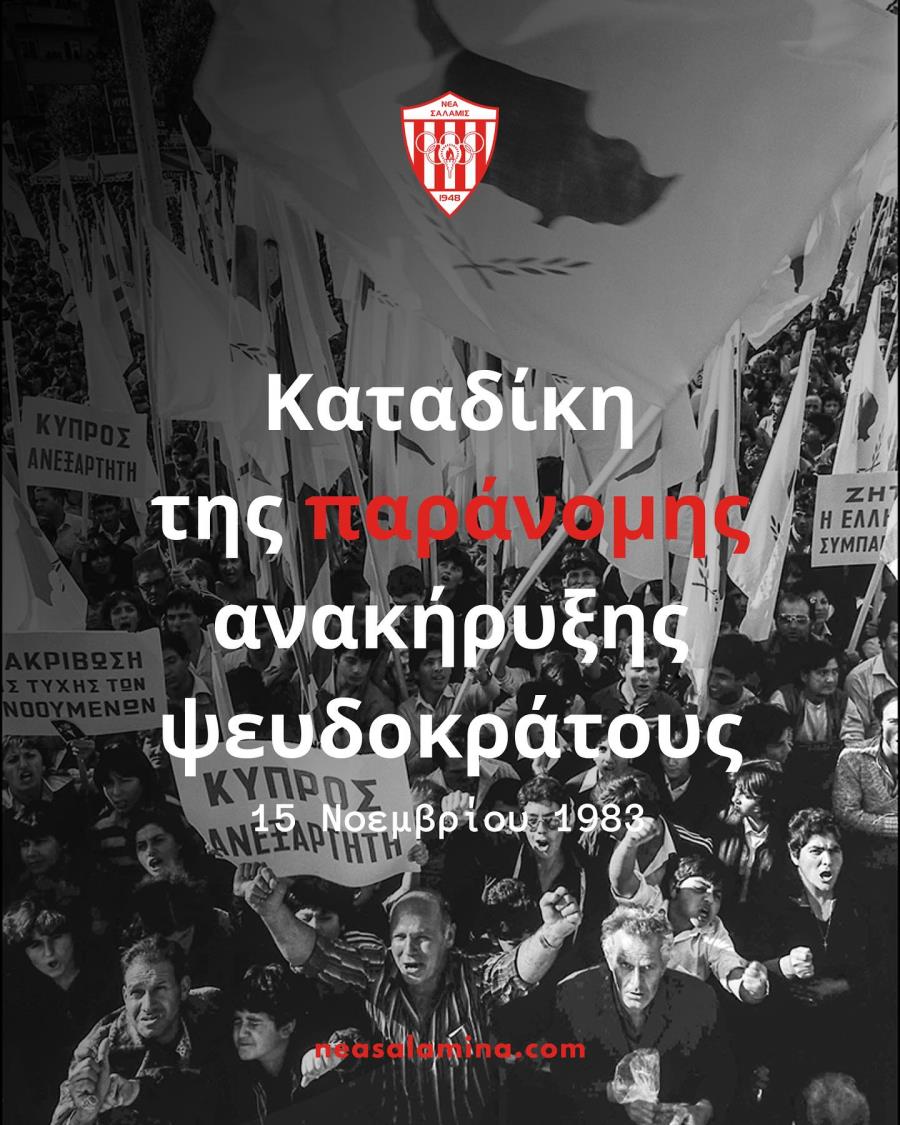 Το Διοικητικό Συμβούλιο της ΝΕΑΣ ΣΑΛΑΜΙΝΑΣ ΑΜΜΟΧΩΣΤΟΥ καταδικάζει απερίφραστα και με τον πλέον έντονο τρόπο την παράνομη ανακήρυξη του ψευδοκράτους, μια μονομερής αποσχιστική πράξη που παραβιάζει το διεθνές δίκαιο και υπονομεύει την κυριαρχία και εδαφική ακεραιότητα της Κυπριακής Δημοκρατίας.