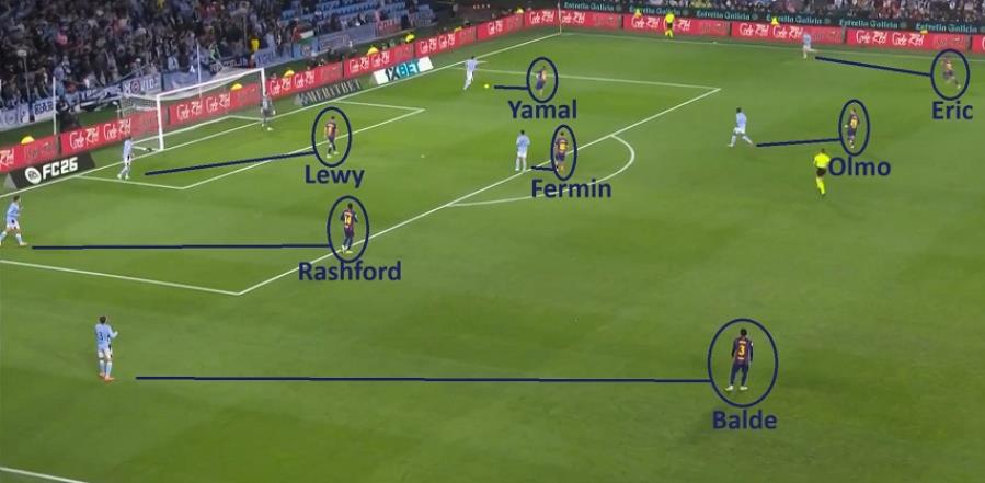 Παράλληλα, η τετράδα της άμυνας τοποθετείται στη μεσαία γραμμή. Προκύπτει αρχικά κενό μεταξύ μέσων και αμυντικών. Μία καλή κυκλοφορία της μπάλας διασπά το πρέσινγκ και μία μπαλιά στον χώρο δημιουργεί έξτρα κενό μισού γηπέδου! Ο εξτρέμ φεύγει στην πλάτη των Μπαλντέ, Γκαρθία, Κουμπαρσί και Κουντέ πασάρει στον ολομόναχο σέντερ φορ και η ζημιά γίνεται.