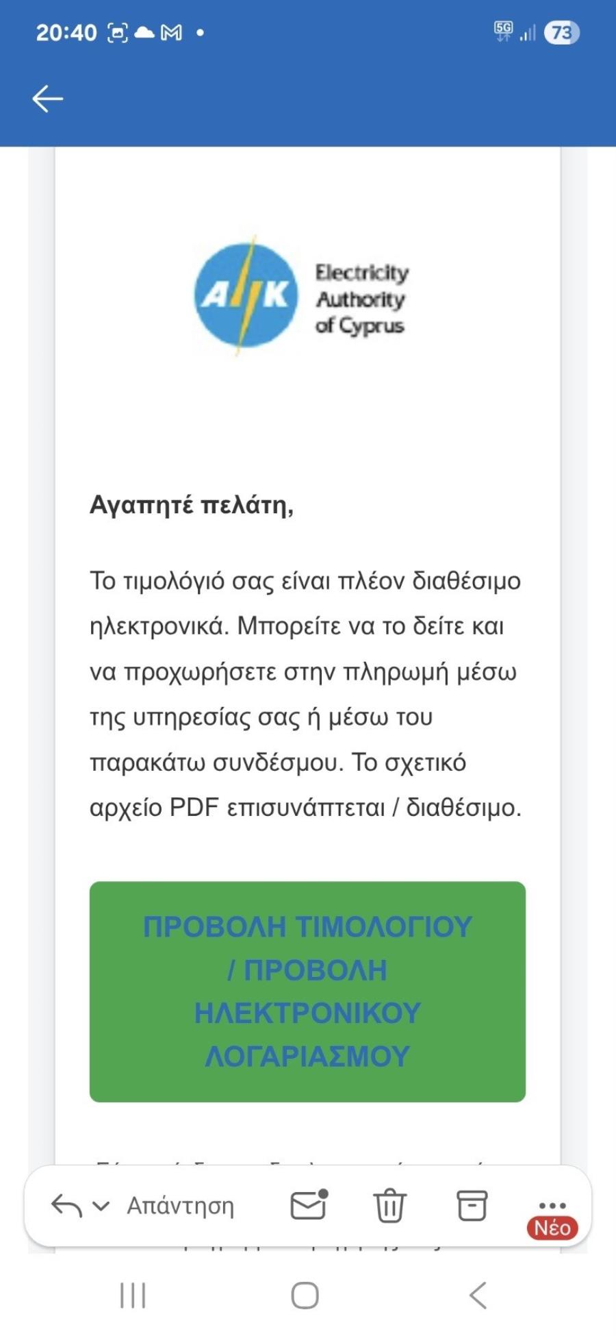 Διευκρινίζεται με έμφαση ότι τα εν λόγω μηνύματα δεν προέρχονται από την ΑΗΚ και αποτελούν απόπειρα ηλεκτρονικής απάτης (phishing).
