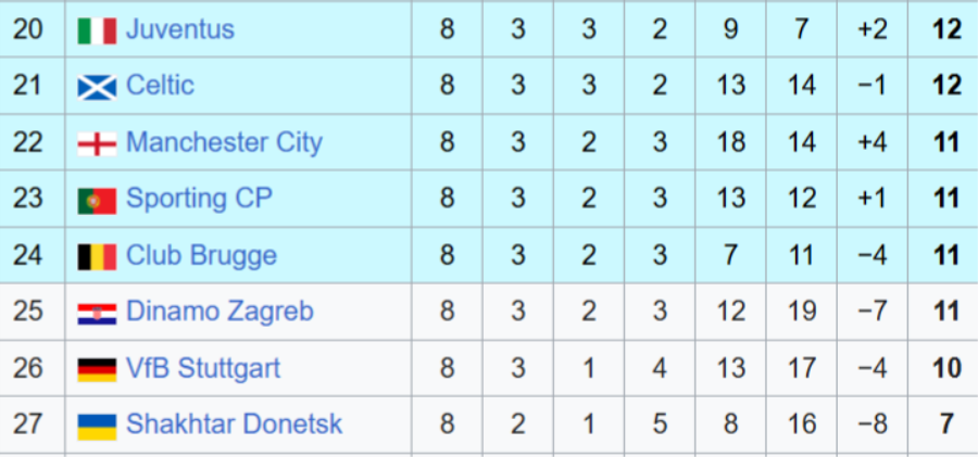 Την περσινή σεζόν πάντως, που ήταν η πρώτη με αυτό τον πρωτότυπο τρόπο διεξαγωγής του Champions League, οι 11 βαθμοί ήταν αρκετοί για Μάντσεστερ Σίτι, Σπόρτινγκ Λισαβόνας και Κλαμπ Μπριζ για να εξασφαλίσουν αντίστοιχα την 22η, 23η και 24η θέση και να προκιθούν έστω και την... υστάτη στην επόμενη φάση, ενώ με τους ίδιους πόντους (11) τερμάτισε 25η η Ντιναμό Ζάγκρεμπ που είχε τη χειρότερη διαφορά τερμάτων και αποκλείστηκε.