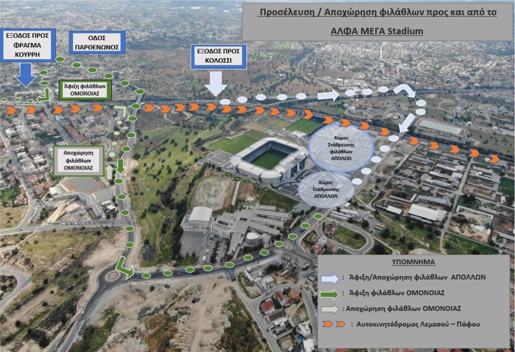Οι φίλαθλοι του ΑΠΟΕΛ θα καταλάβουν τις δυτικές, ανατολικές και νότιες κερκίδες του σταδίου. Ως εκ τούτου γίνεται προτροπή όπως κατευθυνθούν στο στάδιο μέσω του κυκλικού κόμβου του Γ.Σ.Π. και της λεωφόρου Ανεξαρτησίας και να σταθμεύσουν τα οχήματα τους στον νότιο χώρο στάθμευσης οχημάτων.