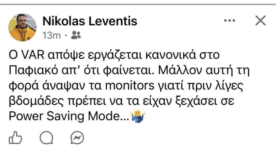 Ο Λεβέντης σε ανάρτηση του τόνισε πως σήμερα δουλεύει το VAR και άφησε υπονοούμενα για την φάση με το τάκλιν του Νταβίντ Λουίζ στον Φιλιώτη της ΑΕΛ πριν από λίγες εβδομάδες, που δεν εξετάστηκε για κόκκινη.