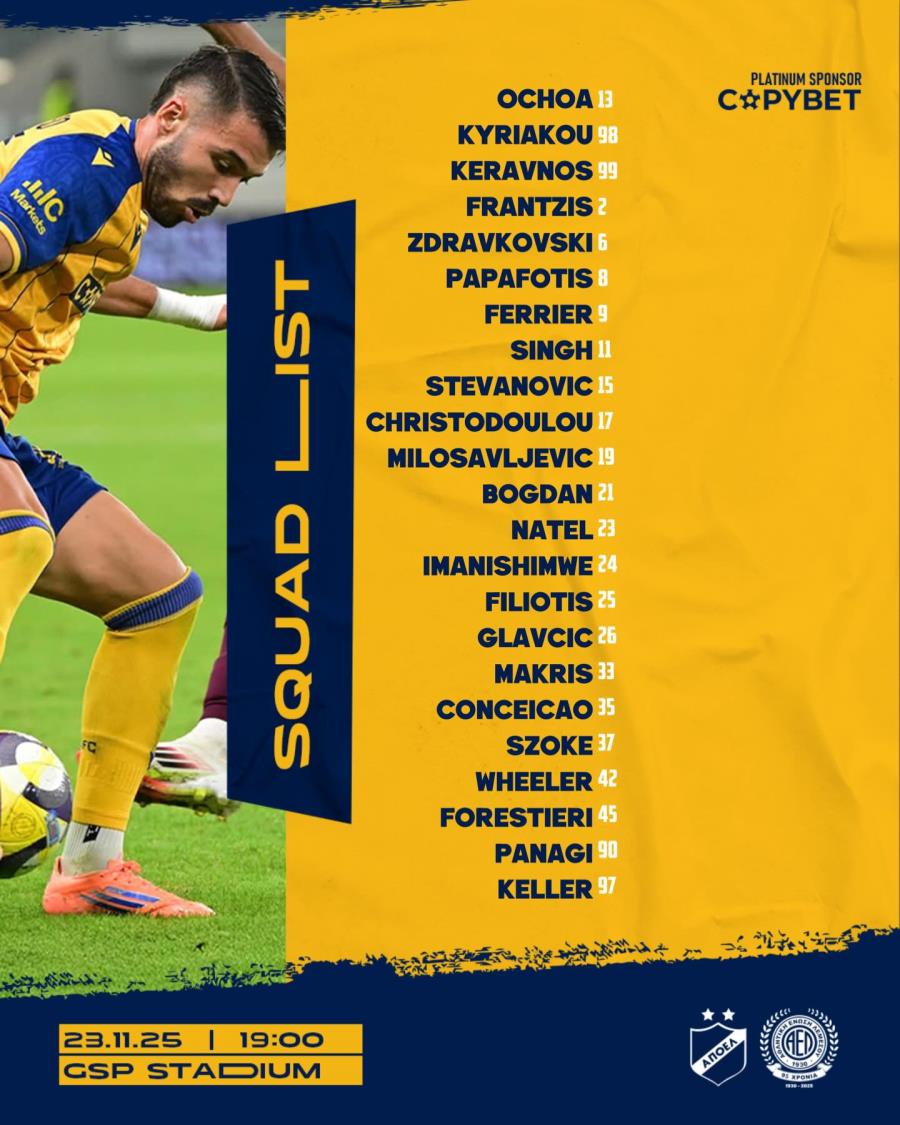 Ολοκληρώθηκε η προετοιμασία της ΑΕΛ για το ντέρμπι του ΓΣΠ κόντρα στον ΑΠΟΕΛ και έγινε γνωστή η αποστολή. Εκτός αποστολής: Ζράντι, Τομάλα, Ουεντραόγκο, Νεοφύτου.