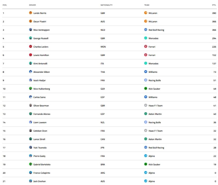 Μετά και την ποινή που δέχθηκαν οι πιλότοι της McLaren, στην κορυφή του βαθμολογικού πίνακα παραμένει ο Λάντο Νόρις με 390 βαθμούς και τους Όσκαρ Πιάστρι και Μαξ Φερστάπεν να ακολουθούν κατά πόδας στο -24 με 366 βαθμούς!