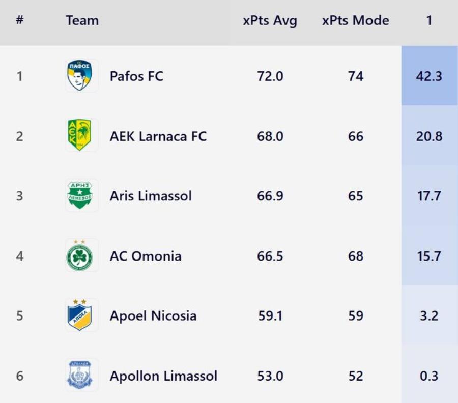 Η παφιακή ομάδα σύμφωνα με την σελίδα «Football Meets Data» αύξησε τις πιθανότητες της για τον τίτλο κατά 15%, ενώ η Ομόνοι ήταν μία από τις χαμένες στη μάχη (-10%). Βελτίωσε κατά 9% την... προοπτική της η ΑΕΚ, ενώ ο ΑΠΟΕΛ παρουσιάζει απώλειες (-16%).
