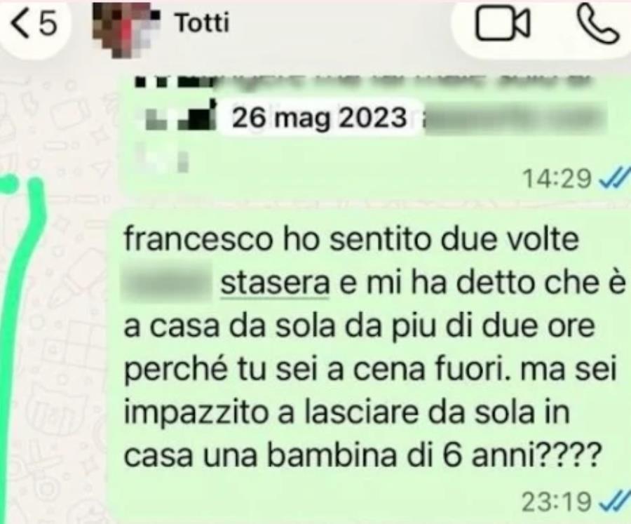 Στην καταγγελία της η Ιλάρι Μπλάζι, παραθέτει και φωτογραφία από την συνομιλία τους, στην οποία αναφέρει χαρακτηριστικά: «Φραντσέσκο, μίλησα με την κόρη μας δύο φορές απόψε και μου είπε ότι είναι μόνη στο σπίτι για πάνω από δύο ώρες επειδή έχεις βγει για δείπνο. Είσαι τρελός που αφήνεις ένα 6χρονο κορίτσι μόνο του στο σπίτι;».