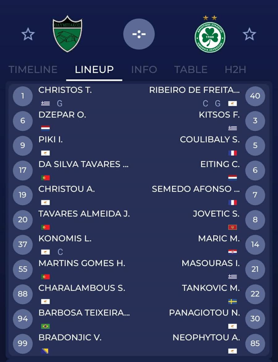 Στον πάγκο: Ουζόχο, Κυριακίδης, Ντιουνκού, Χατζηγιοβάνης, Αγκουζούλ, Ε.Ανδρέου, Χαμάς, Σίμιτς, Κούσουλος, Μουσιαλόφσκι, Εράκοβιτς, Π.Ανδρέου.