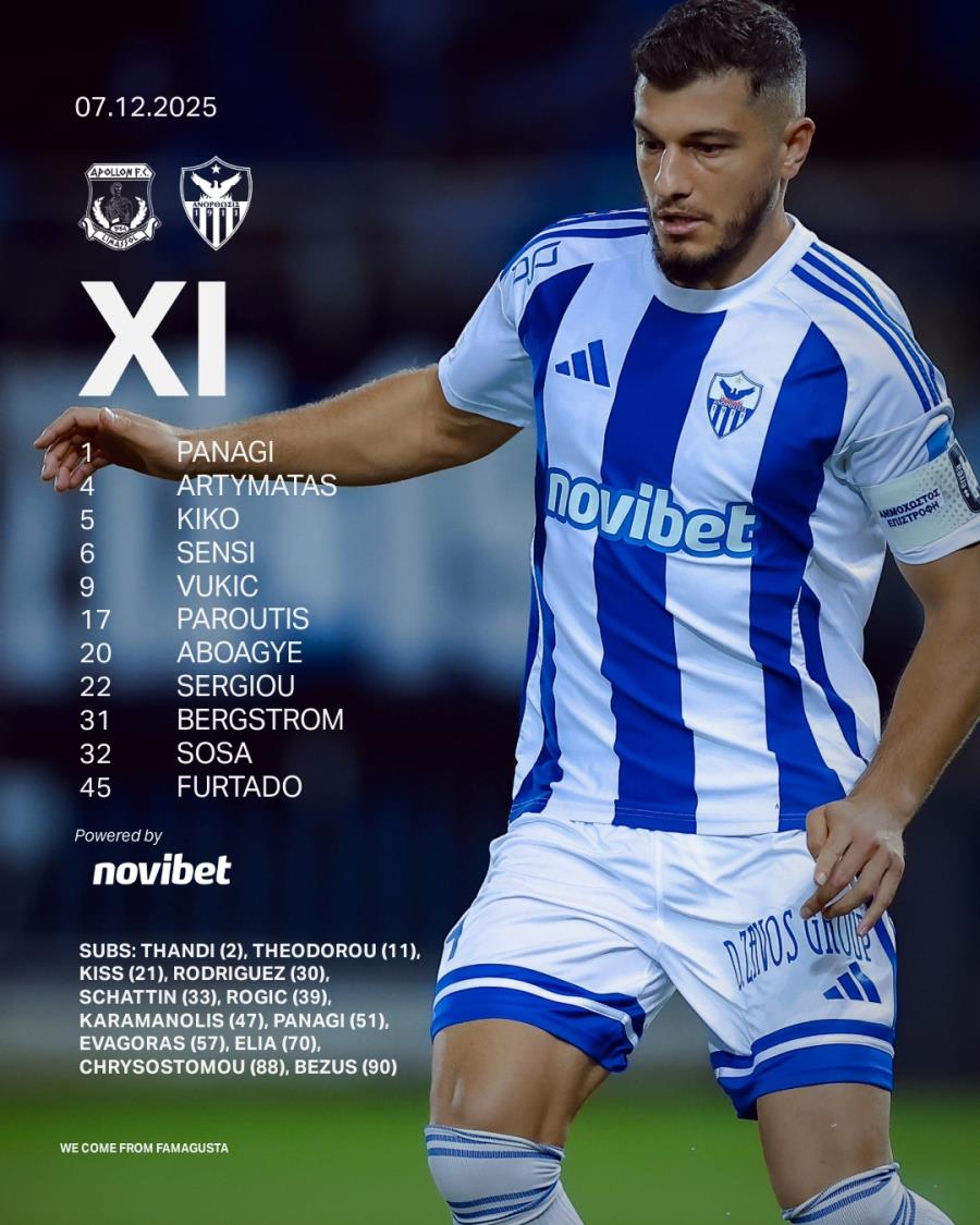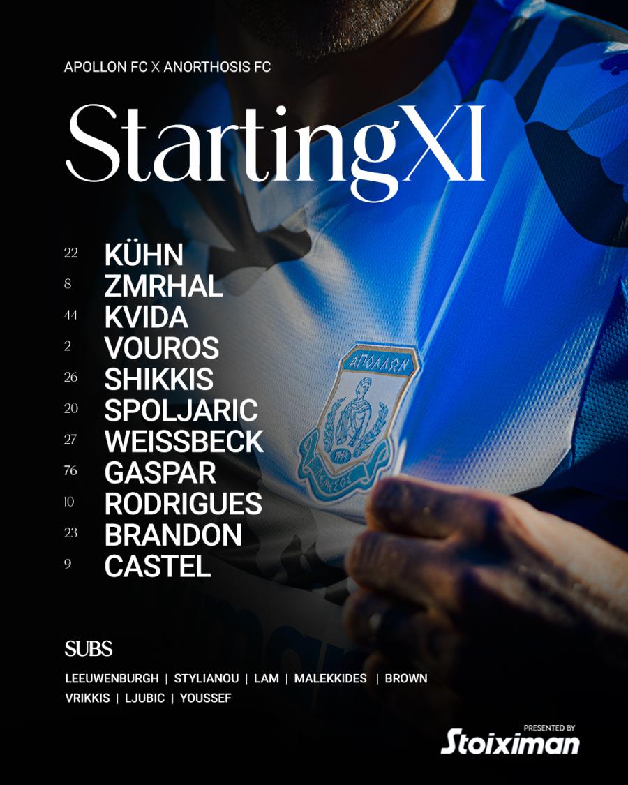 Απόλλων: Κουν, Βούρος, Σμέρχαλ, Καστέλ (66′ Γιούσεφ), Ροντρίγκες (75′ Μαλεκκίδης), Σπόλιαριτς (59′ Λιούπιτς), Μπράντον Τόμας, Σιήκκης, Βεισμπέκ (79′ Μπράουν), Κβίντα, Γκασπάρ (59′ Βρίκκης)
