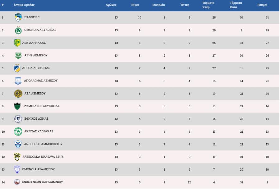 CYPRUS LEAGUE - Απολογισμός Α' γύρου: 13 αγωνιστικές, 245 τέρματα - Καλύτερη επίθεση, άμυνα και πρώτοι σκόρερ