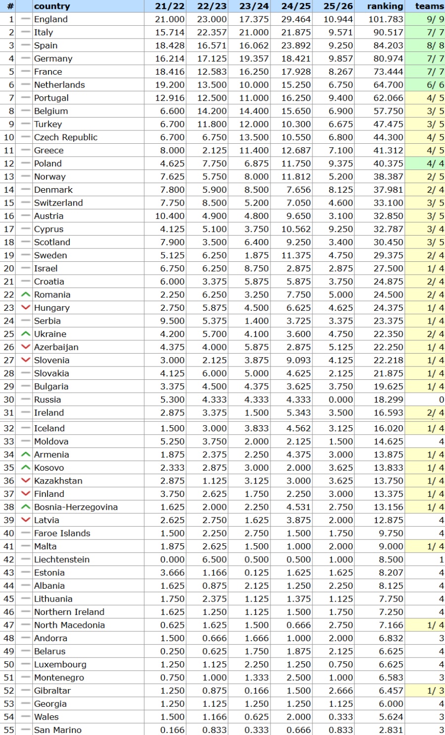 Η διαφορά από την Ελβετία είναι μόλις 333 βαθμοί και αν εξασφαλίσουμε μία νίκη περισσότερη στην ερχόμενη αγωνιστική των ευρωπαϊκών διοργανώσεων θα κάνουμε σημαντικό βήμα για την 15η θέση μέχρι το τέλος της σεζόν.