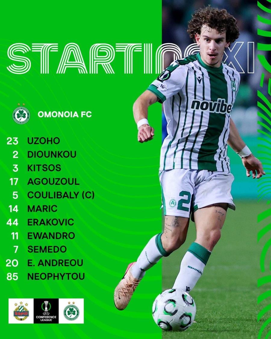 Δείτε την αρχική ενδεκάδα που επέλεξε ο προπονητής της Ομόνοιας, Χένινγκ Μπεργκ, για το αποψινό (22:00) παιχνίδι στο «Allianz Stadion» με αντίπαλο τη Ραπίντ Βιέννης, για την 5η αγωνιστική της League Phase του Conference League: