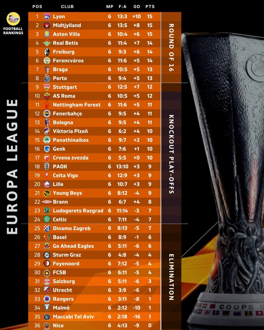 Όσον αφορά στις δύο ελληνικές ομάδες, ο Παναθηναϊκός είναι 15ος, στο -3 από την οκτάδα και στο +3 από την 25η Ντινάμο Ζάγκρεμπ, με τον ΠΑΟΚ να έχει έναν βαθμό λιγότερο από τους «πράσινους» και να είναι 18ος.