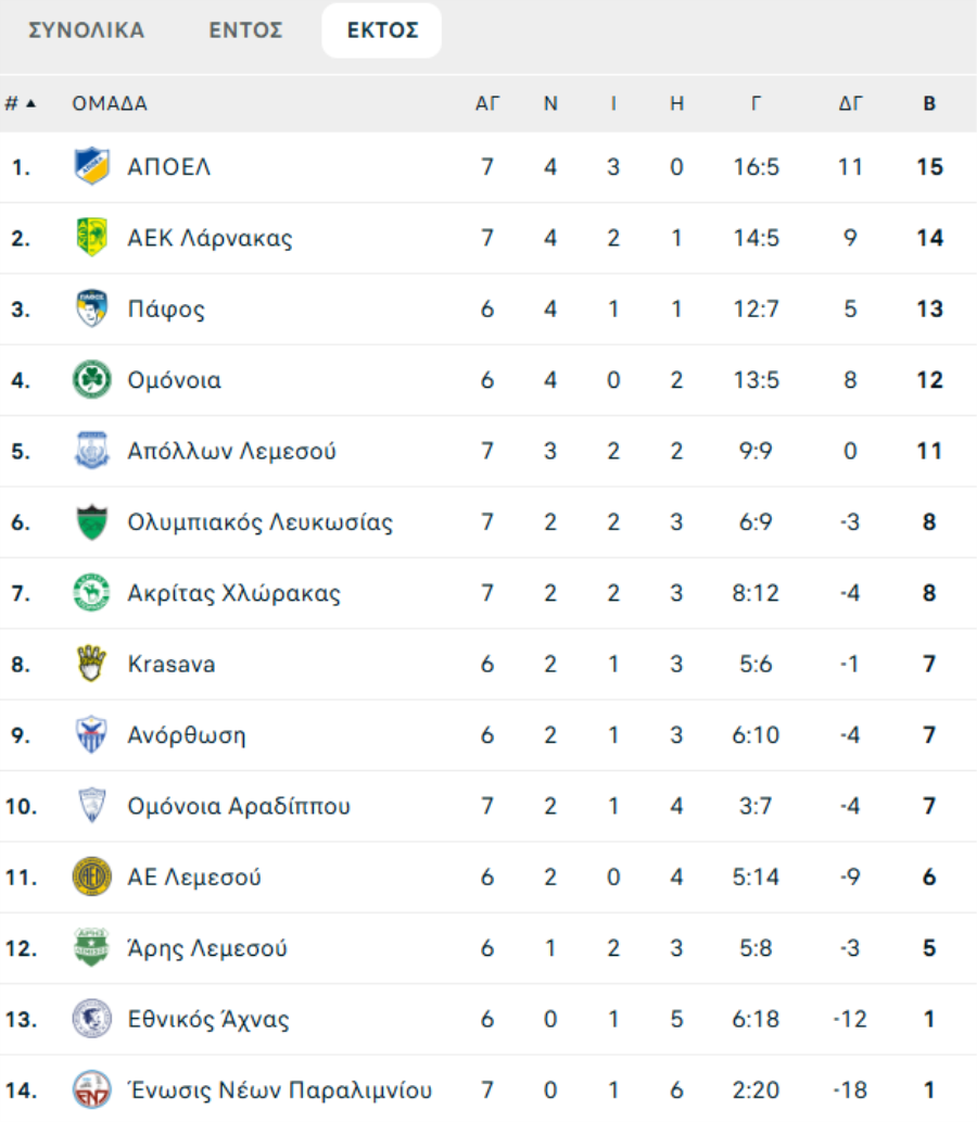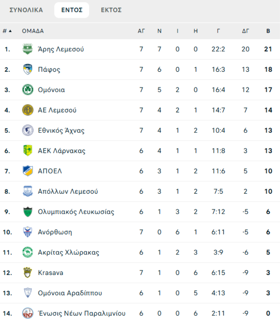 Συγκεκριμένα, στους εντός έδρας αγώνες ο Άρης άγγιξε το τέλειο με 7 νίκες σε ισάριθμους αγώνες, ενώ ο ΑΠΟΕΛ με 15 βαθμούς είναι στην κορυφή των εκτός έδρας αγώνων.