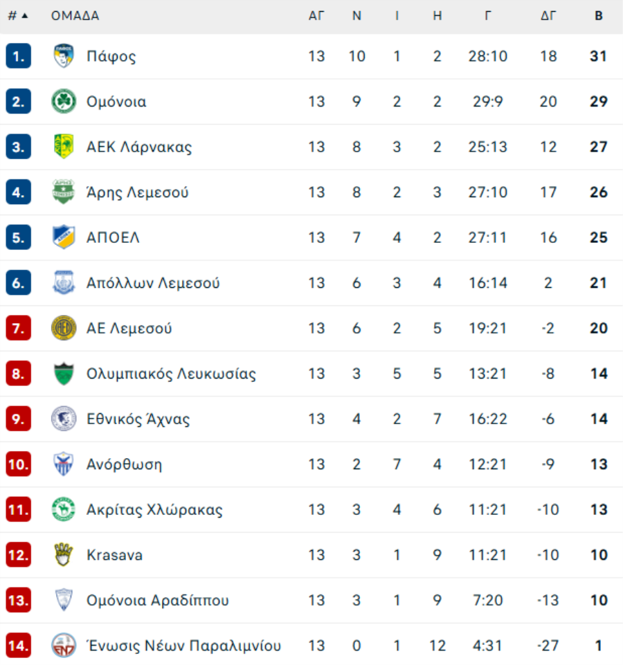 13η αγωνιστική (05/12):Πάφος–Ακρίτας 4-0 (Kορέια 34', Μπρούνο 42', Άντερσον 74', Αντωνίου 78' αυτ.)