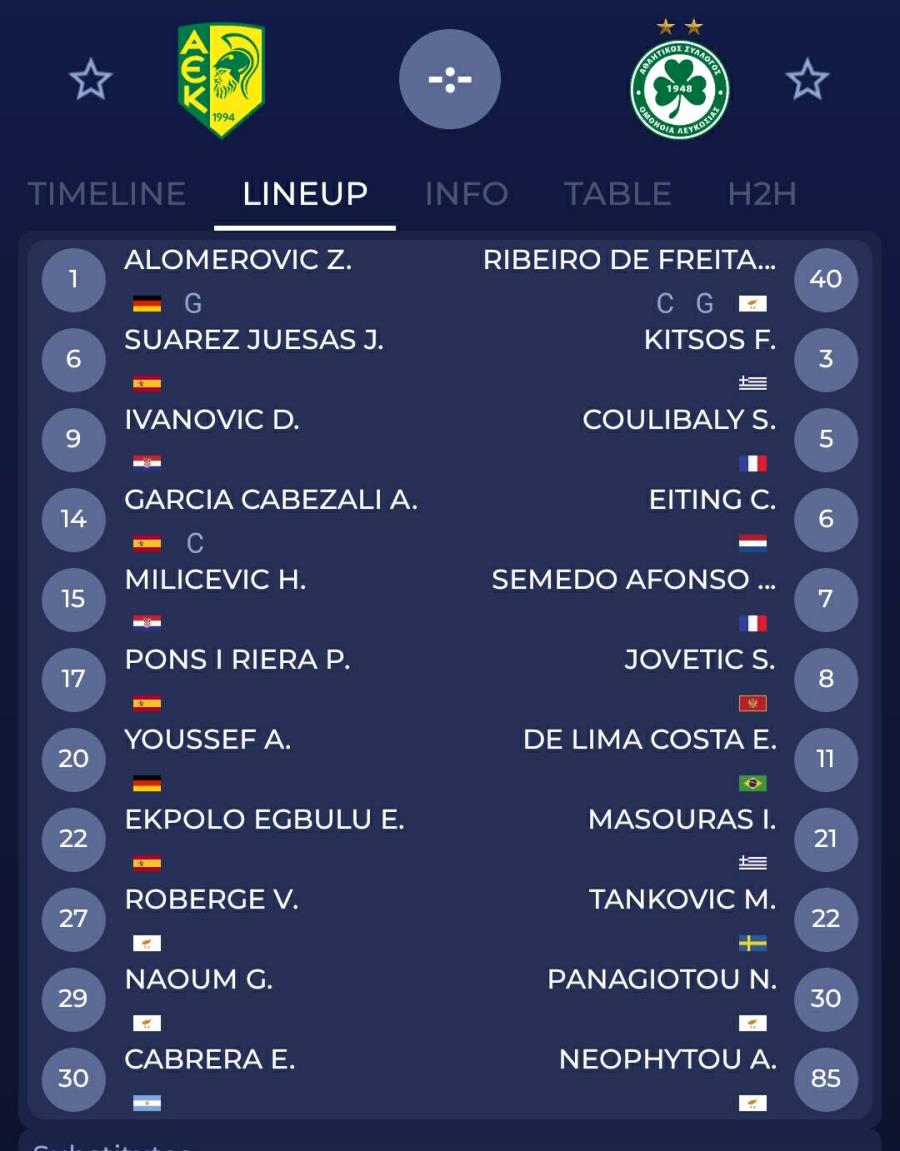 ΑΕΚ:Αλομέροβιτς, Σουάρες, Ιβάνοβιτς, Γκαρσία, Μιλίτσεβιτς, Πονς, Αμίν, Εκπολό, Ρομπέρζ, Ναούμ, Καμπρέρα.