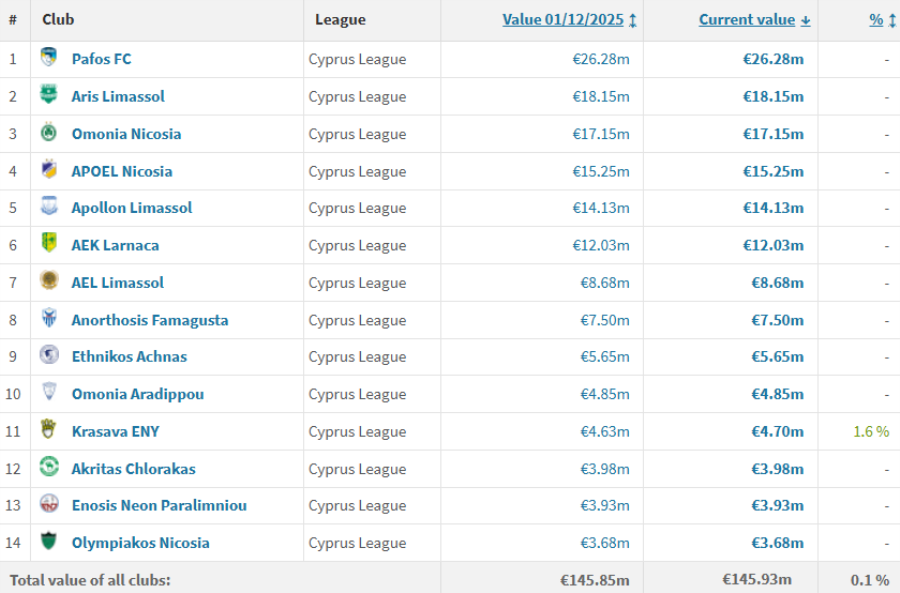 Η Πάφος είναι σταθερά στην κορυφή με χρηματιστηριακή αξία 25,28 εκ., ενώ μόνο η ΕΝΥ... ανέβασε την αξία της με άνοδο ύψους 1.6%.