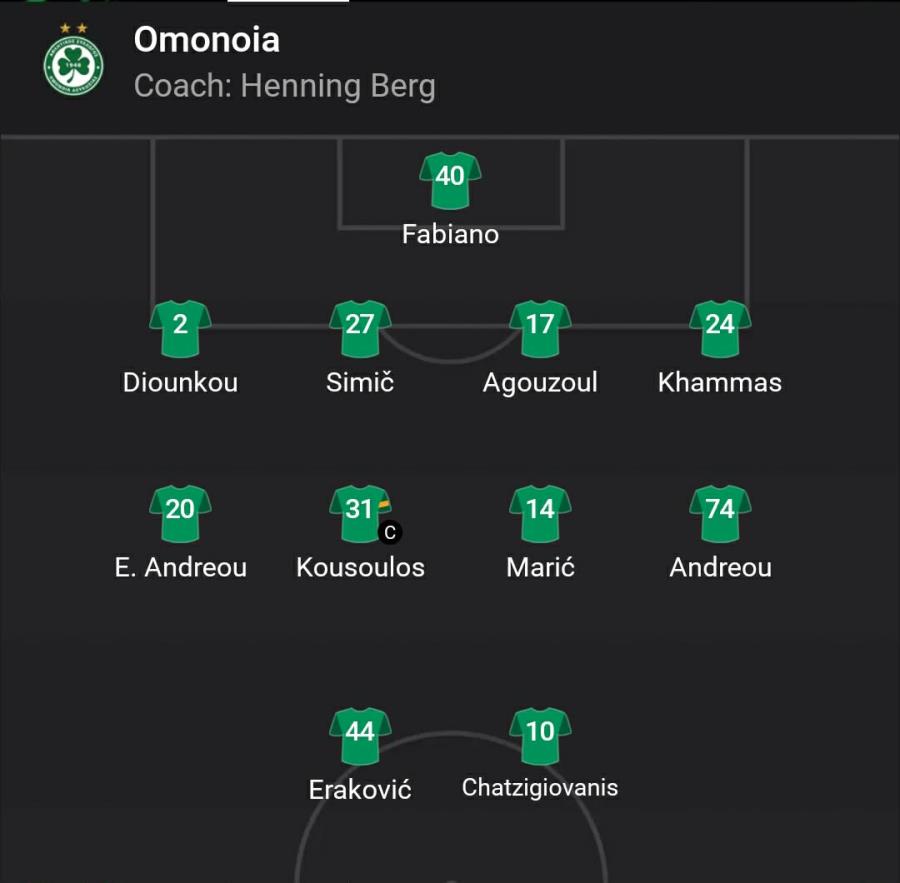 Δείτε την αρχική ενδεκάδα που επέλεξε ο προπονητής της Ομόνοιας, Χένινγκ Μπεργκ, για το αποψινό (22:00) ματς στο ΓΣΠ με αντίπαλο την Πολωνική Ρακόφ, για την 6η αγωνιστική της League Phase του Conference League: