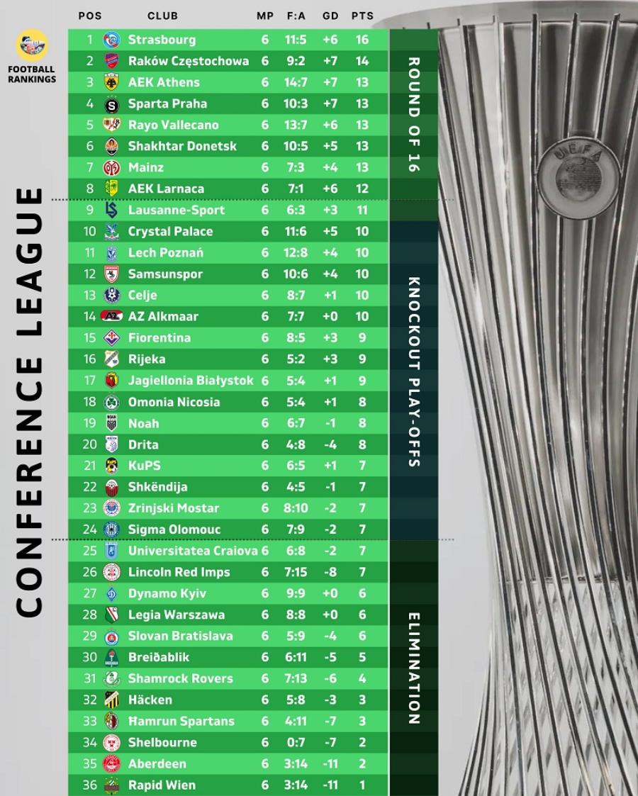 Η τελική ΒΑΘΜΟΛΟΓΙΑ του Conference League - Απευθείας πρόκριση στους «16» για ΑΕΚ, στα μπαράζ η Ομόνοια