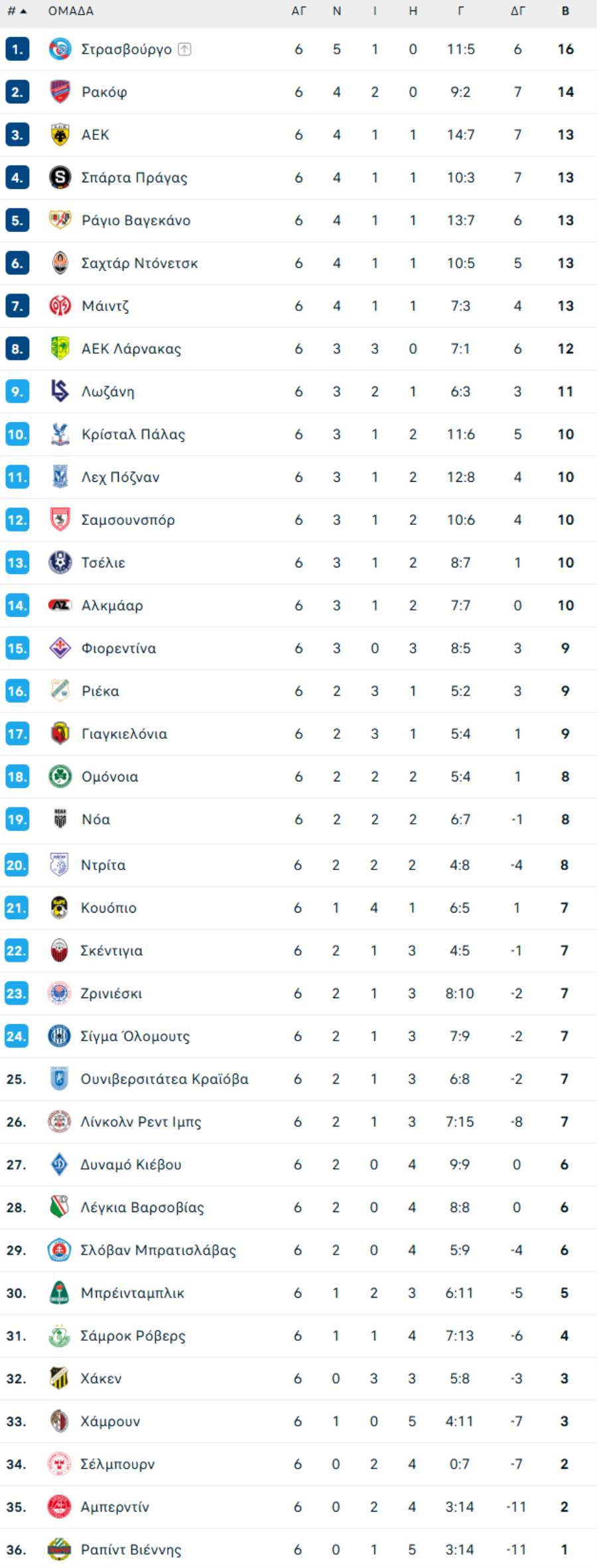 Η ΑΕΚ Λάρνακας και η ΑΕΚ Αθηνών τερμάτισαν στην πρώτη οκτάδα της League Phase του Conference League και προκρίθηκαν απευθείας στους «16», ενώ η Ομόνοια τερμάτισε στη 18η θέση και θα λάβει μέρος στην ενδιάμεση φάση (πλέι-οφ), διεκδικώντας ένα εισιτήριο για τους 16».