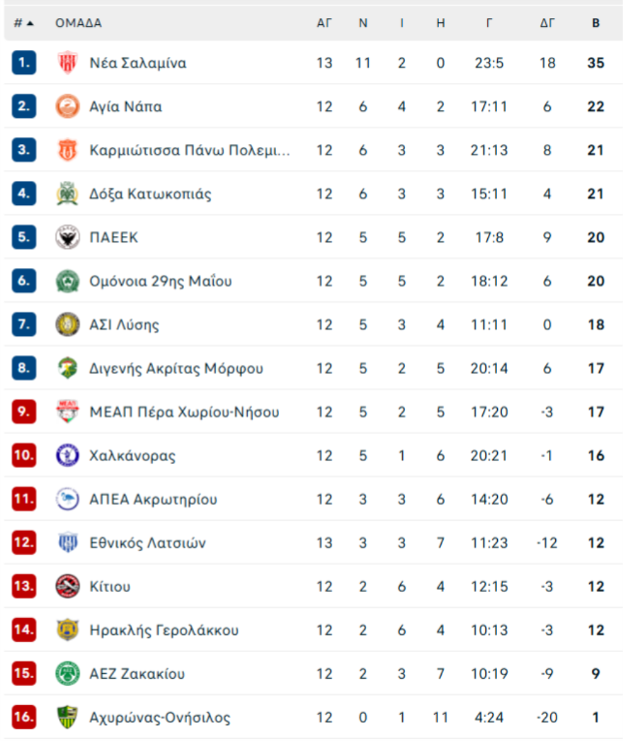 Η ΒΑΘΜΟΛΟΓΙΑ μετά από 12 αγωνιστικές: