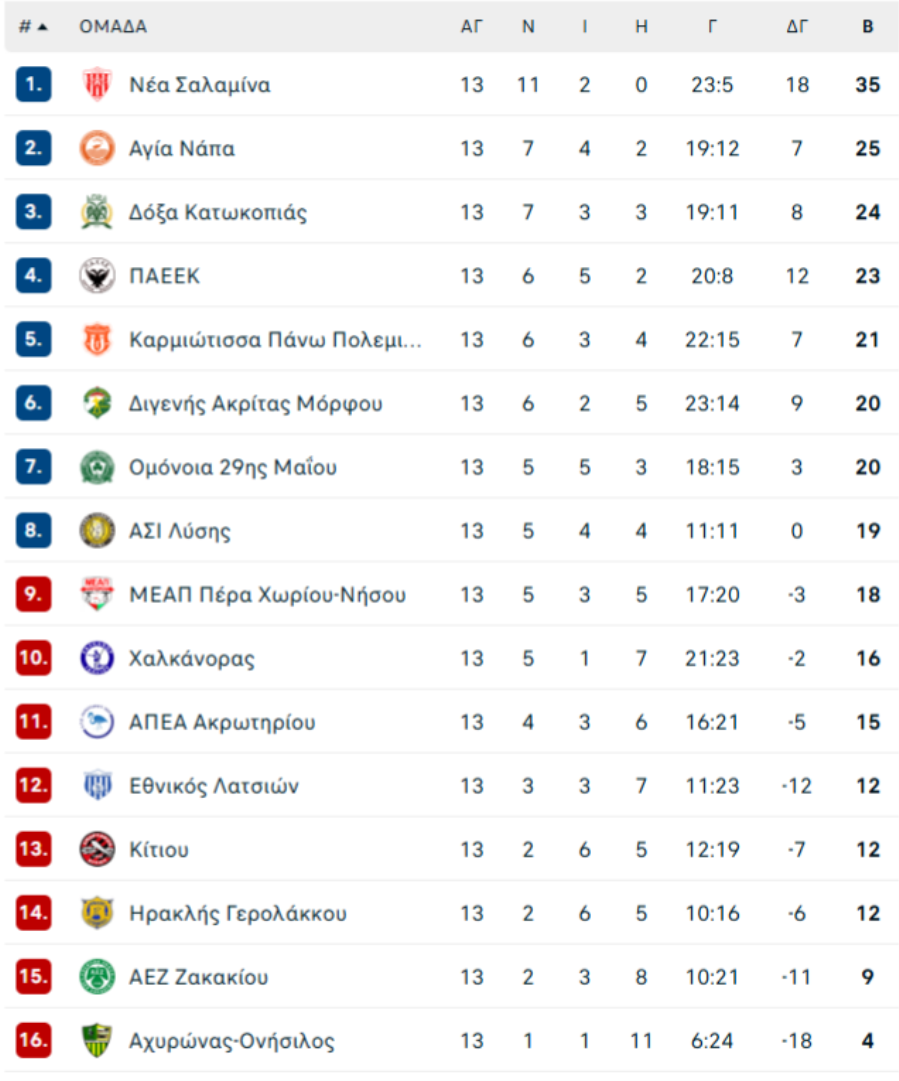 Η ΒΑΘΜΟΛΟΓΙΑ μετά από 13 αγωνιστικές: