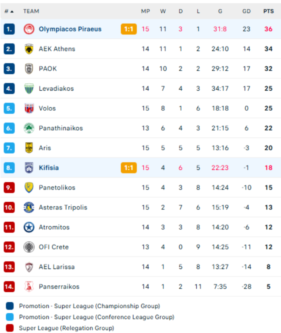 Πράγματι, οι «ερυθρόλευκοι» έμειναν στο 1-1 κόντρα στη μαχητική Κηφισιά στο «Γ. Καραϊσκάκης», με αποτέλεσμα να ανέβουν στους 36 βαθμούς και στο +2 από την ΑΕΚ, η οποία την Κυριακή (21/12) θα φιλοξενήσει τον ΟΦΗ με την ευκαιρία να περάσει στην κορυφή.