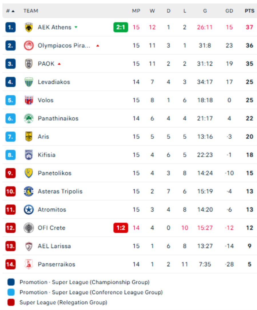 Παράλληλα, μετά τη μεγάλη νίκη στο ντέρμπι με τον Παναθηναϊκό, ο ΠΑΟΚ ανέβηκε στους 35 βαθμούς, με τρεις ομάδες να βρίσκονται σε απόσταση δύο βαθμών στη μάχη του τίτλου!
