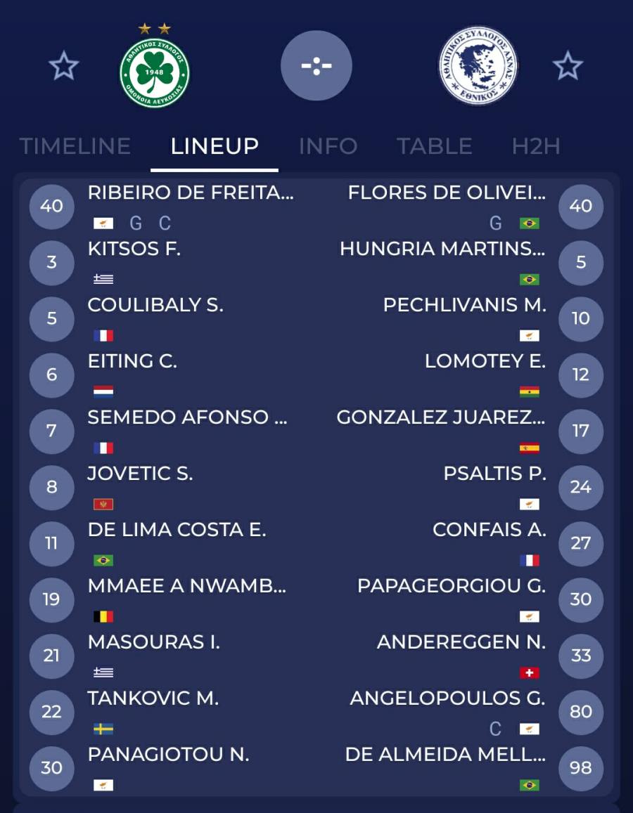 Εθνικός: Φλόρες, Φελίπε, Πεχλιβάνης, Λομοτέι, Γκονζάλεθ, Ψάλτης, Κονφαίς, Παπαγεωργίου, Αντερέγκεν, Αγγελόπουλος, Μπρένο