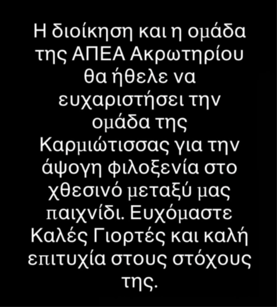 Με ανάρτηση της στα social media, η ΑΠΕΑ Ακρωτηρίου ευχαριστεί την Καρμιώτισσα για τη φιλοξενία της στο προχθεσινό (20/12) μεταξύ τους παιχνίδι που έγινε στο γήπεδο των Πάνω Πολεμιδιών, για τη 13η αγωνιστική του πρωταθλήματος Β' κατηγορίας.