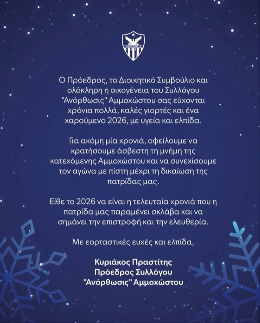 «Η Ανόρθωση εύχεται σε όλους χρόνια πολλά, καλές γιορτές με υγεία και το βλέμμα πάντα στραμμένο στη μάνα Αμμόχωστο