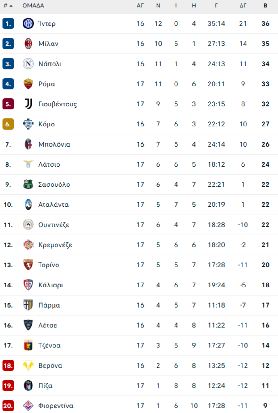Έτσι, οι «τζαλορόσι» στην 4η θέση με 33 βαθμούς παρέμειναν κοντά στην κορυφή, αφού είναι στο -3 από την πρωτοπόρο Ίντερ (36β.), ενώ στη 2η και την 3η θέση είναι η Μίλαν (35β.) και η Νάπολι (34β.) αντίστοιχα.