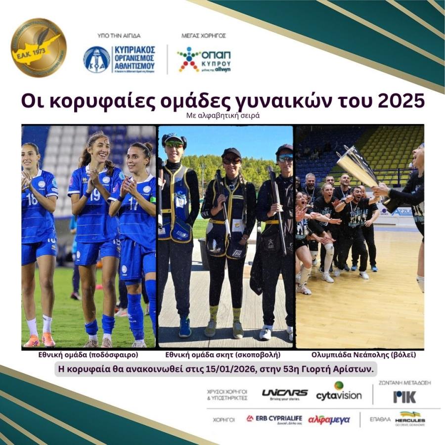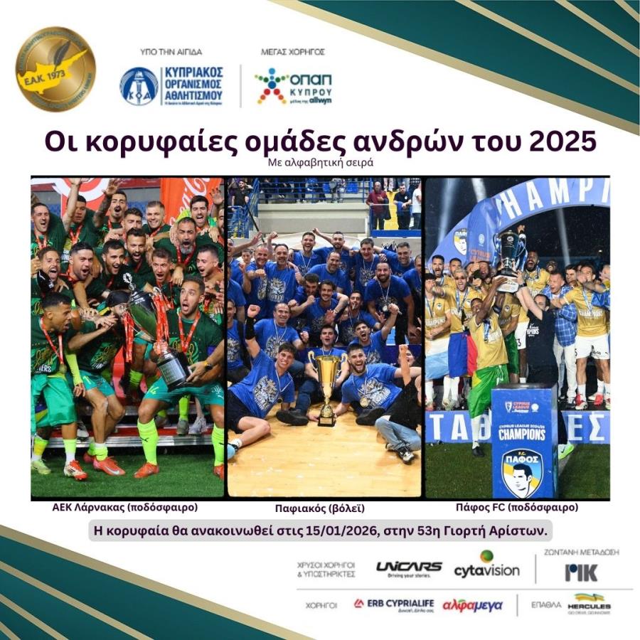 - Πάφος FC (ποδόσφαιρο): Το 2025 ήταν ιστορική χρονιά για την ομάδα. Για πρώτη φορά αναδείχθηκε πρωταθλήτρια, για τη σεζόν 2024-25, με απολογισμό 82 βαθμούς και 26 νίκες σε 36 αγώνες, ενώ πλησίασε και στο νταμπλ, όμως ηττήθηκε στον τελικό στα πέναλτι από την ΑΕΚ. Από την ίδια ομάδα, έχασε στο παιχνίδι του σούπερ καπ στα πέναλτι. Έπειτα, ήρθε η νέα εκτόξευση στην Ευρώπη. Αποκλείοντας κατά σειρά στα προκριματικά τις Μακάμπι Τελ Αβίβ, Ντιναμό Κιέβου και Ερυθρό Αστέρα, προκρίθηκε στη League Phase του UEFA Champions League, δίνοντας συνέχεια στην περσινή περίοδο (2024-25), οπότε είχε φθάσει μέχρι τους «16» του Conference League. Στη League Phase του UEFA Champions League, πραγματοποίησε εντυπωσιακές εμφανίσεις έχοντας (όταν ξεκίνησε η ψηφοφορία της ΕΑΚ) έξι βαθμούς σε έξι αγώνες (0-0 με Ολυμπιακό εκτός, 1-5 ήττα από Μπάγερν εντός, 0-0 με Καϊράτ εκτός, 1-0 νίκη με Βιγιαρεάλ εντός, 2-2 με Μονακό εντός, 2-0 ήττα από Γιουβέντους εκτός). Toν Ιανουάριο θα αγωνιστεί με τις Tσέλσι (εκτός) και Σλάβια Πράγας (εντός) κι από τα αποτελέσματα θα εξαρτηθεί εάν θα συνεχίσει στον θεσμό.